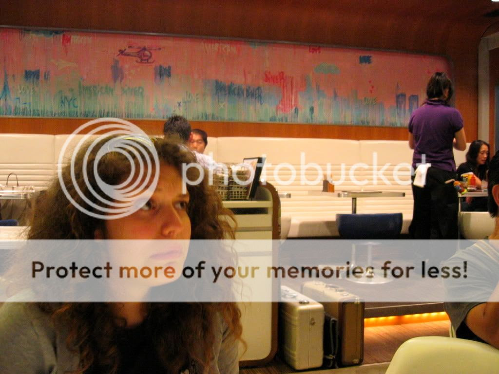So here's Julie in the airport, upon learning of the typhoon, the impending turbulent flight, and noticing that the mural behind her is one of twin towers and an airplane. Though when they incredulously inspected it further, they noted it was painted in 1996.